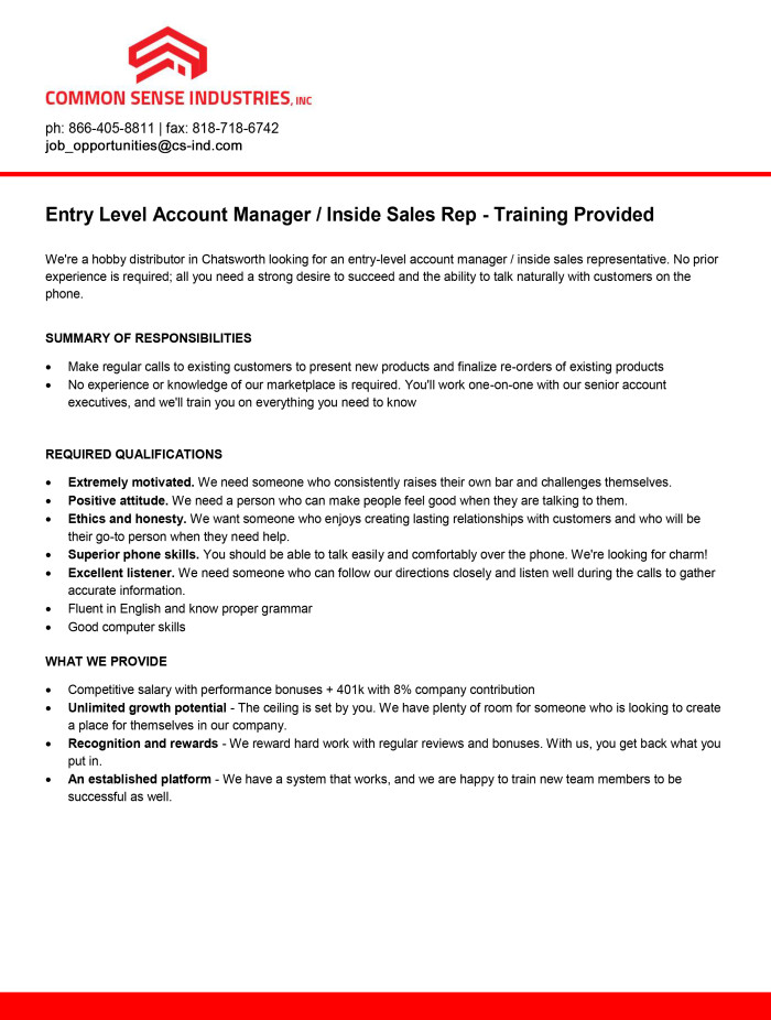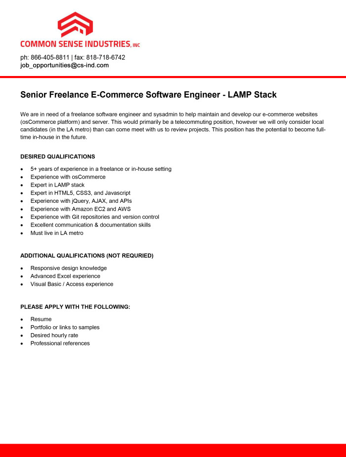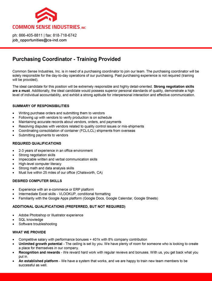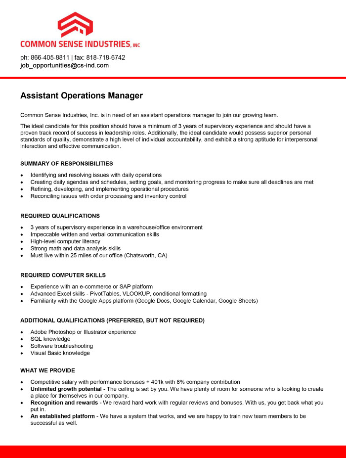 In my role as Director of Operations at Common Sense Industries, Inc., I was responsible for recruiting and hiring for all positions at the company. I wrote all of the attached job postings to attract the best possible talent and reach individuals specifically qualified for our openings. As both a manager and a recruiter, I considered it an essential part of my role to make the expectations and requirements of each position as clear and concise as possible — both for the benefit of the company and the employees.